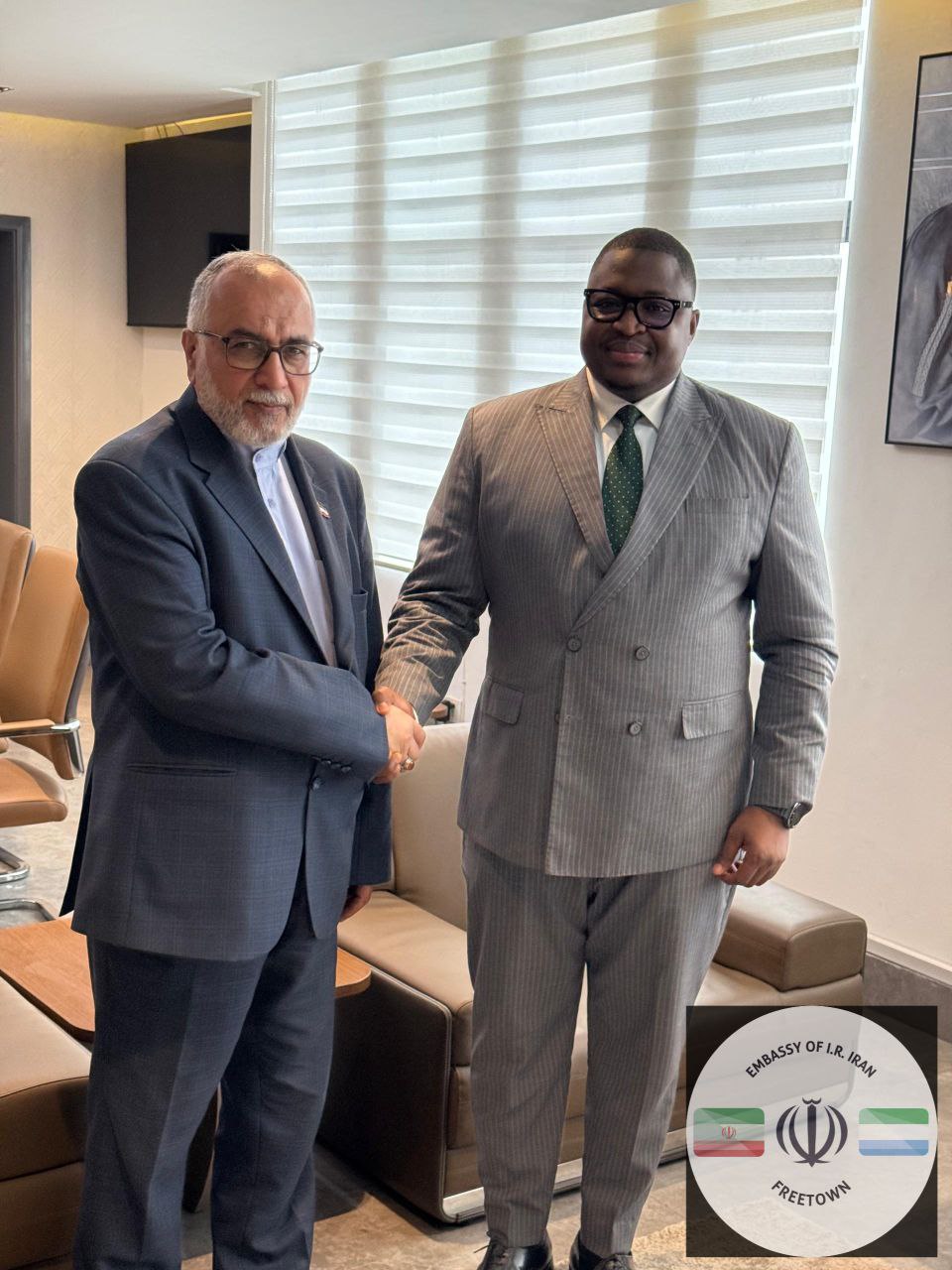 سفیر محترم کشورمان در فری تاون، جناب آقای سید خلیل ساداتی امیری، در پایان ماموریت دیپلماتیک خود در جمهوری سیرالئون، روز دوشنبه مورخ 13 مرداد 1404 با آقای الحاجی موسا تیموتی کابا، وزیر امور خارجه و همکاری‌های بین‌المللی این کشور، در محل این وزارتخانه دیدار و گفتگو نمود.